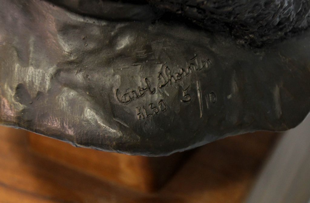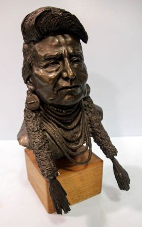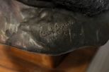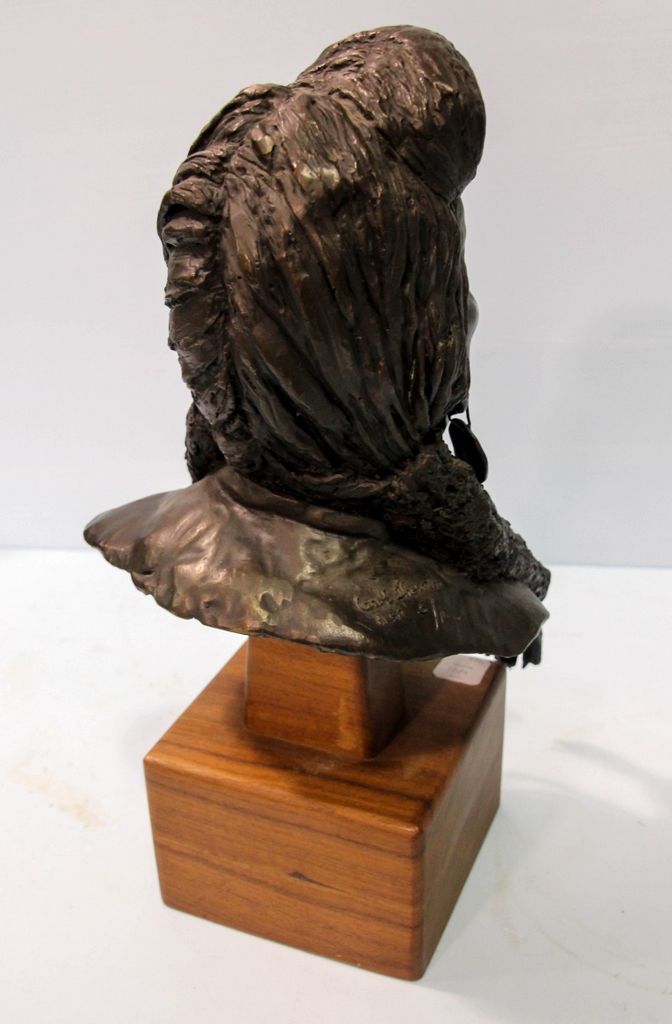 Limited edition great detail work bronze Indian head with earring sand necklace signed Carol Thornton. 5/10 on wood base.; 10" w., 10" d., 17" h. Limited edition great detail work bronze Indian head with earring sand necklace signed Carol Thornton. 5/10 on wood base.; 10" w., 10" d., 17" h.