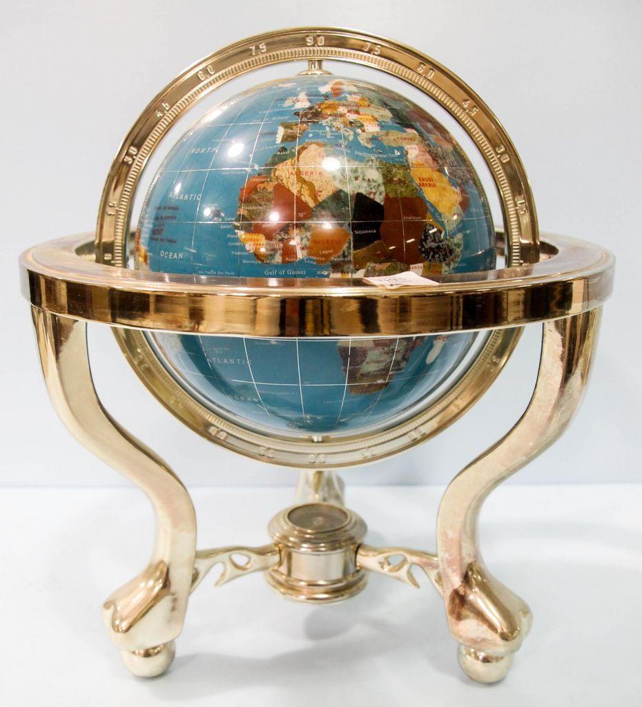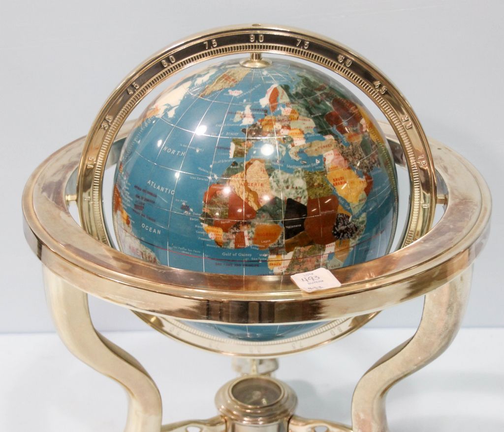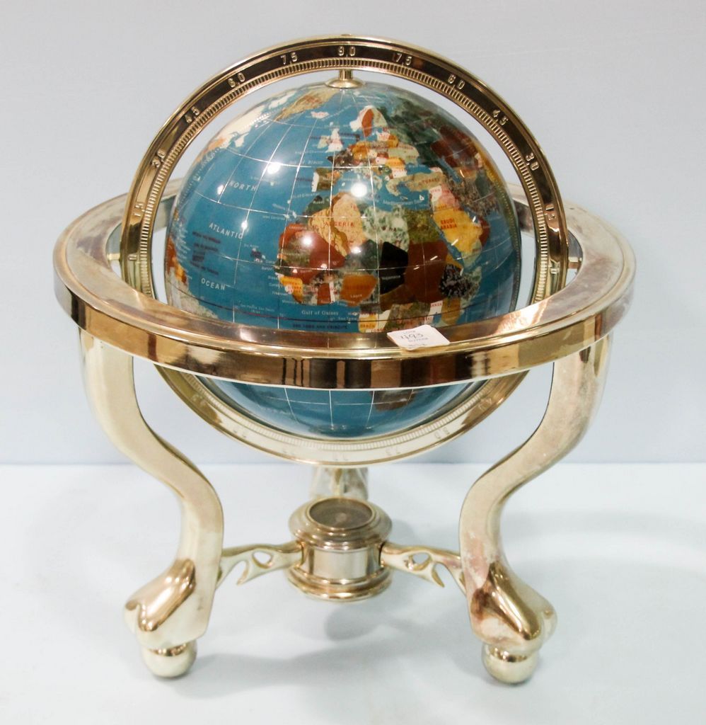 8" gemstone Ocean World globe with compass, sits on claw footed metal stand.; 17" h. 8" gemstone Ocean World globe with compass, sits on claw footed metal stand.; 17" h.