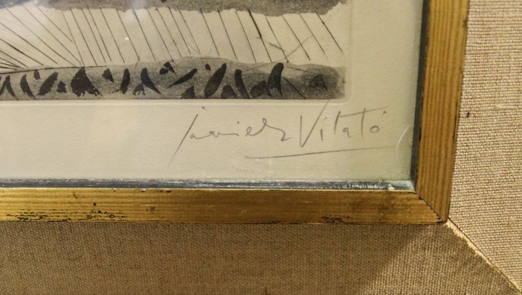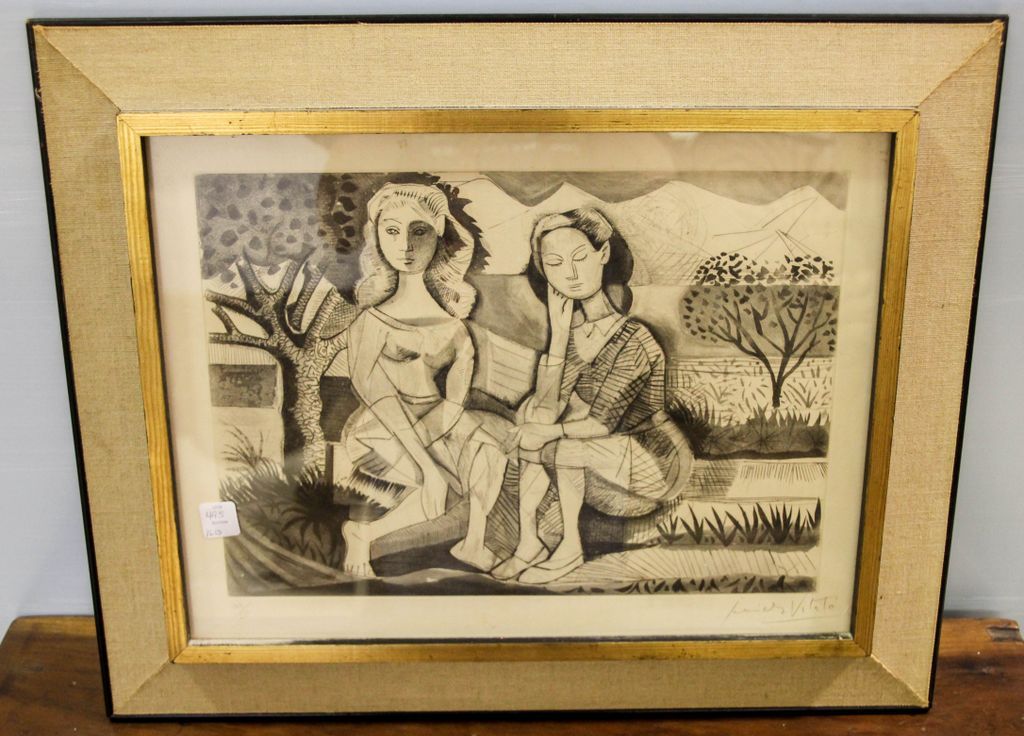 Mid century (c. 1960) etching of two women signed and numbered lower right Javier Vilato (Spanish 1921-2000).; 24" w., 19 1/2" h. Mid century (c. 1960) etching of two women signed and numbered lower right Javier Vilato (Spanish 1921-2000).; 24" w., 19 1/2" h.