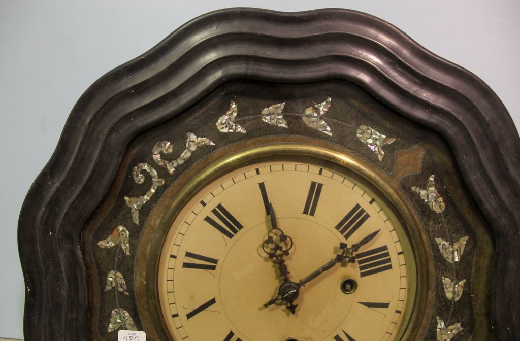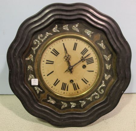 French Napoleon III ebonized and mother of pearl wall clock, has key.; 19" w., 19" h. French Napoleon III ebonized and mother of pearl wall clock, has key.; 19" w., 19" h.