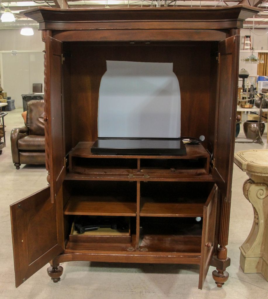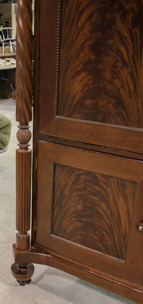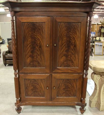 Beautiful antique style mahogany four door entertainment center with swirl carved columns and pineapple and beading, matches lot 771.; 49" w., 25" d., 75 1/2" h. Beautiful antique style mahogany four door entertainment center with swirl carved columns and pineapple and beading, matches lot 771.; 49" w., 25" d., 75 1/2" h.