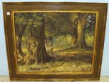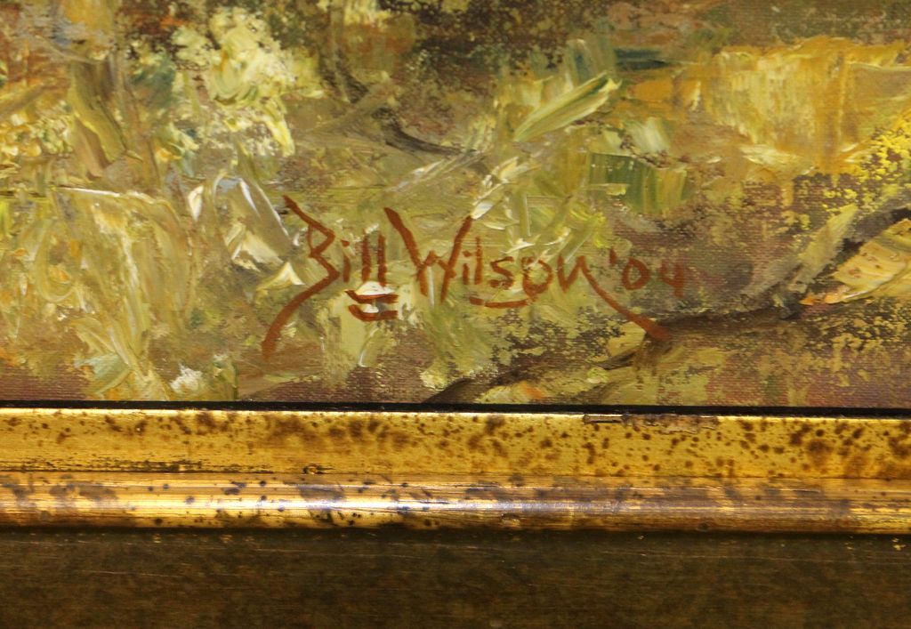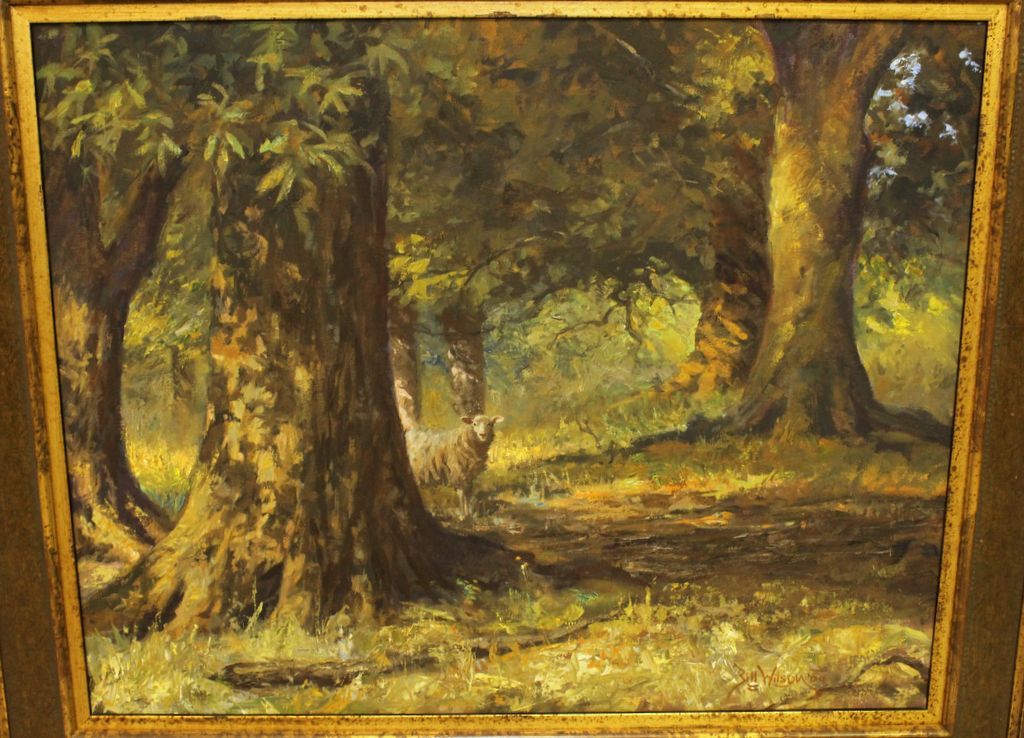 Oil painting of sheep peeking around the tree signed Bill Wilson (local Mississippi artist) '04.; 37" w., 31 1/2" h. Oil painting of sheep peeking around the tree signed Bill Wilson (local Mississippi artist) '04.; 37" w., 31 1/2" h.
