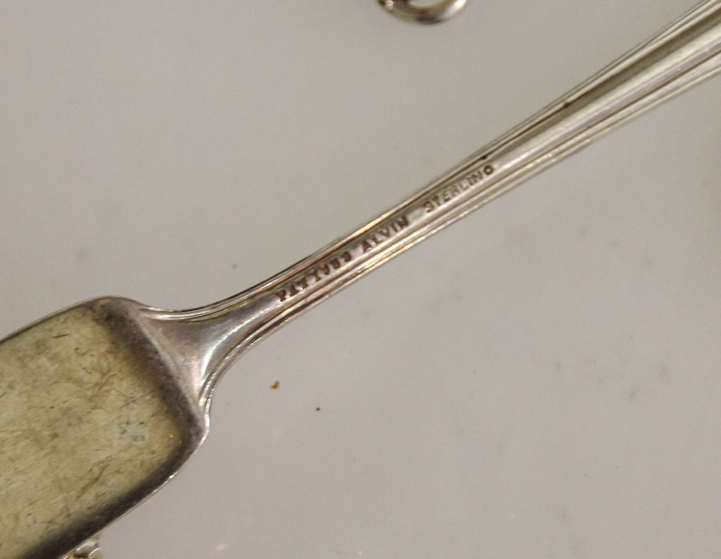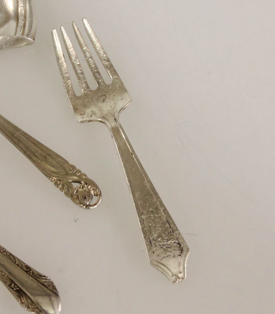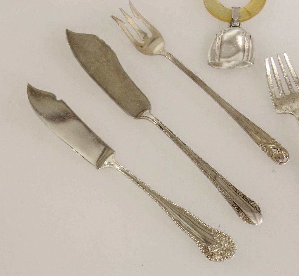 Consisting of two sterling butter knives, sterling cocktail fork, baby fork and damaged rattler; 3.20 troy ounces Consisting of two sterling butter knives, sterling cocktail fork, baby fork and damaged rattler; 3.20 troy ounces