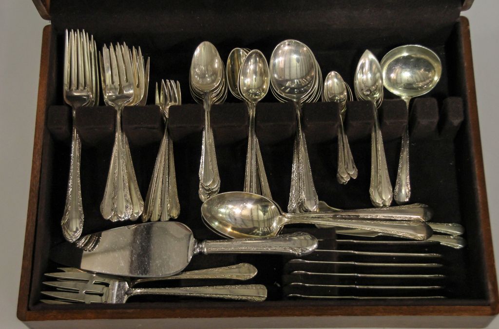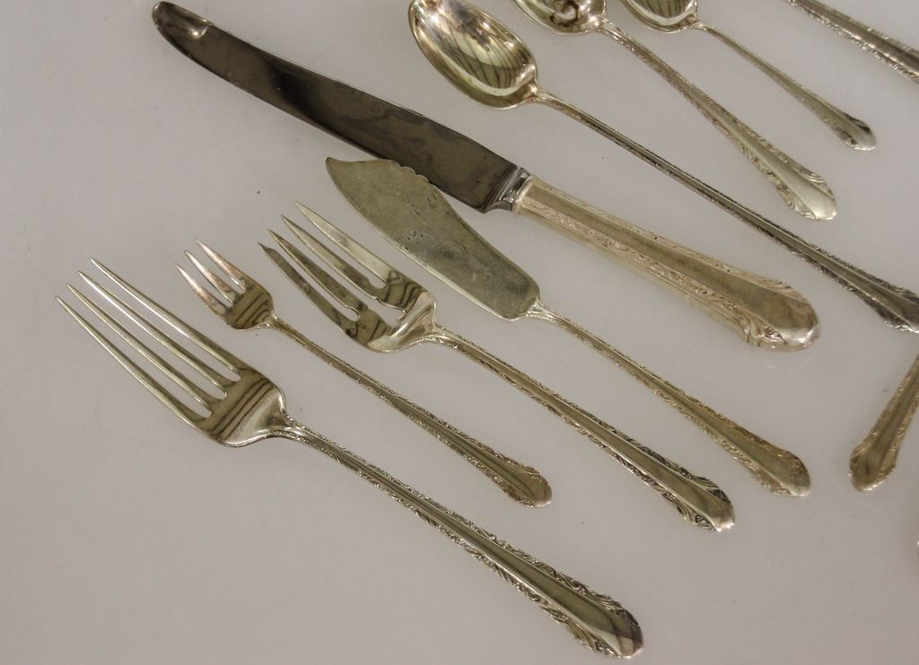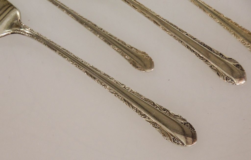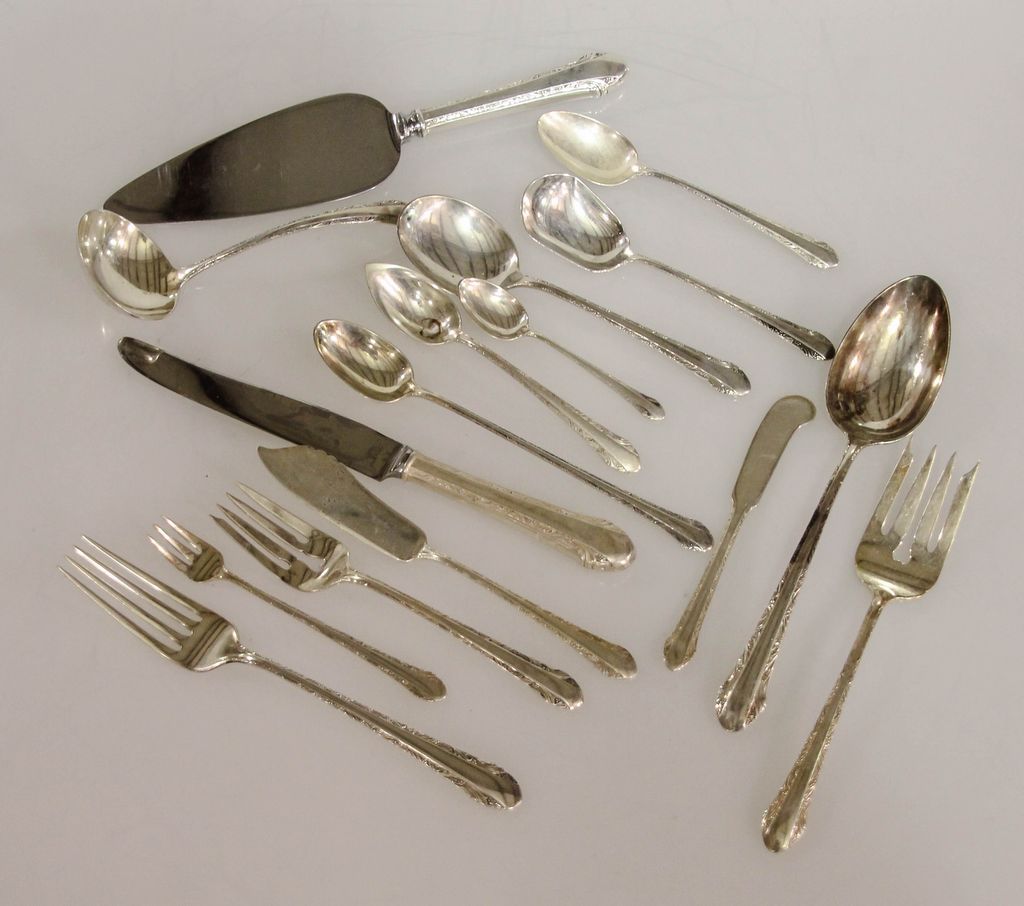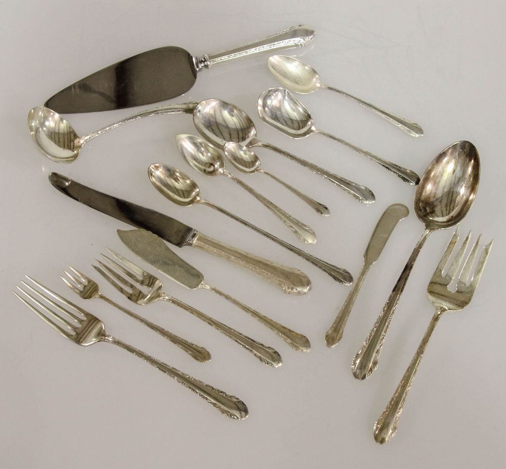 Set of Alvin sterling flatware (1933) consisting of eight dinner forks, twelve salad forks, eight cocktail forks, thirteen teaspoons, eight soup spoons, eight iced teaspoons, seven grapefruit spoons, eight demitasse spoons, eight knives, eight butter knives and eight serving pieces, 97 total pieces, 90.465 troy ounces Set of Alvin sterling flatware (1933) consisting of eight dinner forks, twelve salad forks, eight cocktail forks, thirteen teaspoons, eight soup spoons, eight iced teaspoons, seven grapefruit spoons, eight demitasse spoons, eight knives, eight butter knives and eight serving pieces, 97 total pieces, 90.465 troy ounces