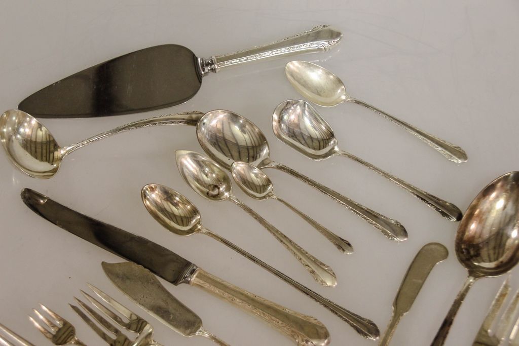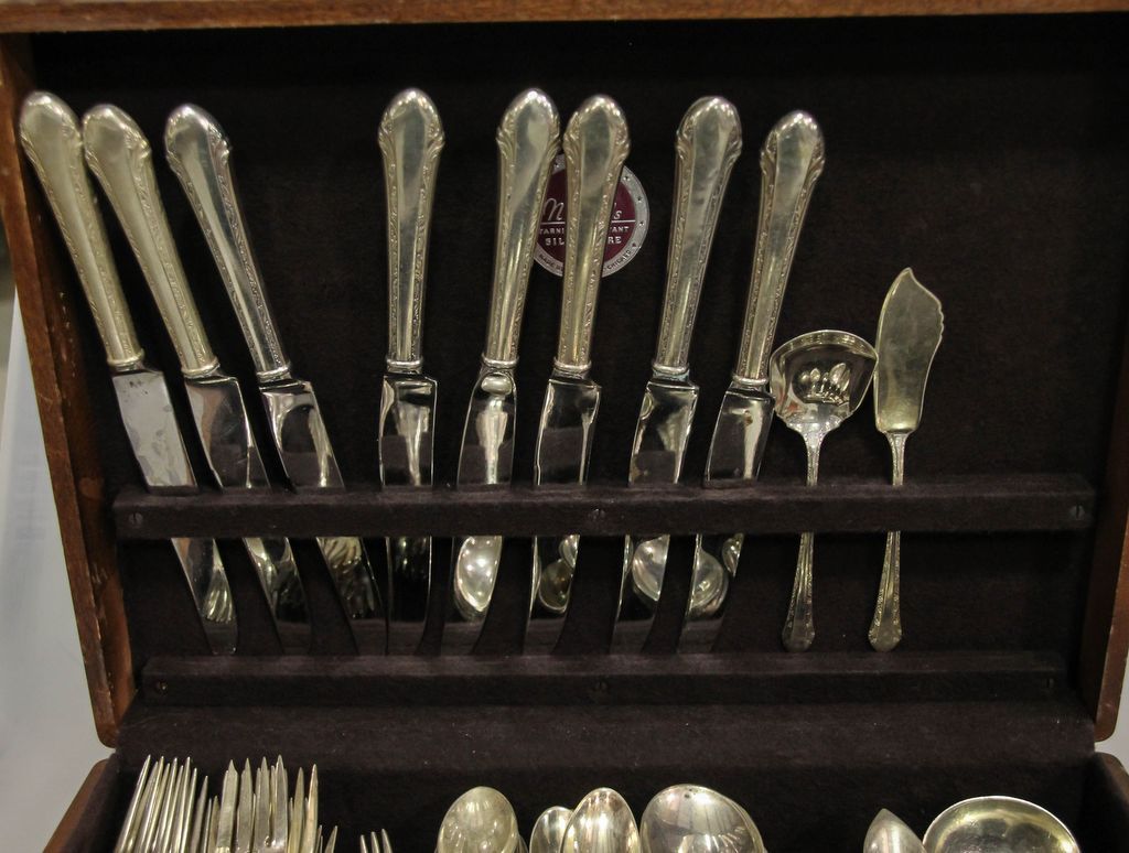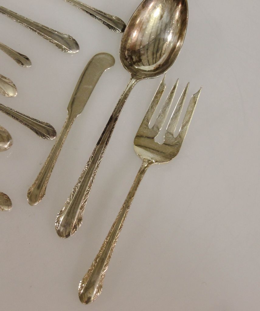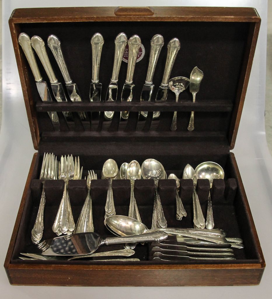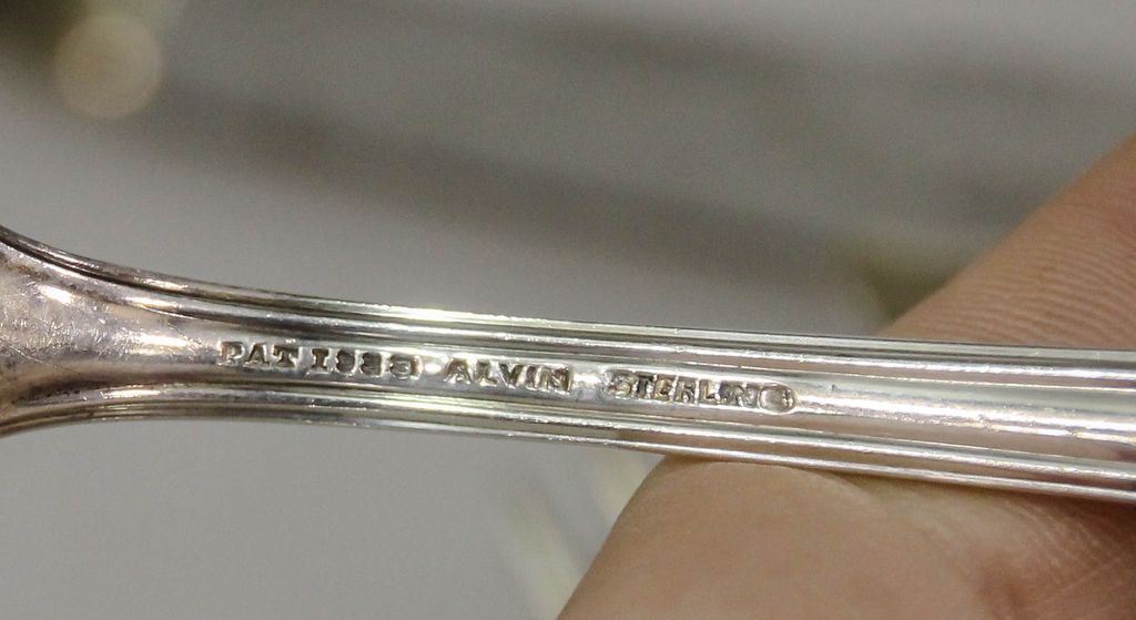 Set of Alvin sterling flatware (1933) consisting of eight dinner forks, twelve salad forks, eight cocktail forks, thirteen teaspoons, eight soup spoons, eight iced teaspoons, seven grapefruit spoons, eight demitasse spoons, eight knives, eight butter knives and eight serving pieces, 97 total pieces, 90.465 troy ounces Set of Alvin sterling flatware (1933) consisting of eight dinner forks, twelve salad forks, eight cocktail forks, thirteen teaspoons, eight soup spoons, eight iced teaspoons, seven grapefruit spoons, eight demitasse spoons, eight knives, eight butter knives and eight serving pieces, 97 total pieces, 90.465 troy ounces
