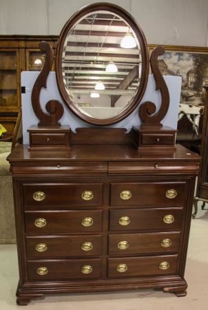 Mahogany bracket foot twelve drawer chest with mirror.; 50" w., 19" d., 74" h. Mahogany bracket foot twelve drawer chest with mirror.; 50" w., 19" d., 74" h.