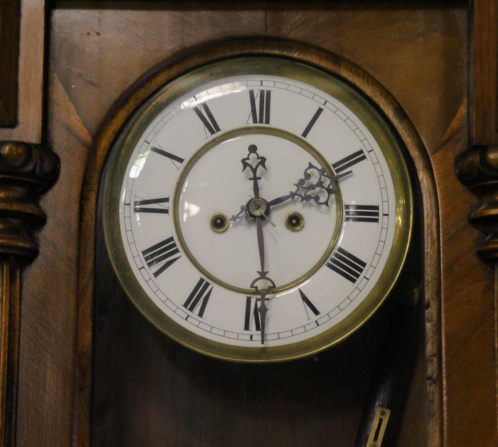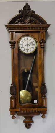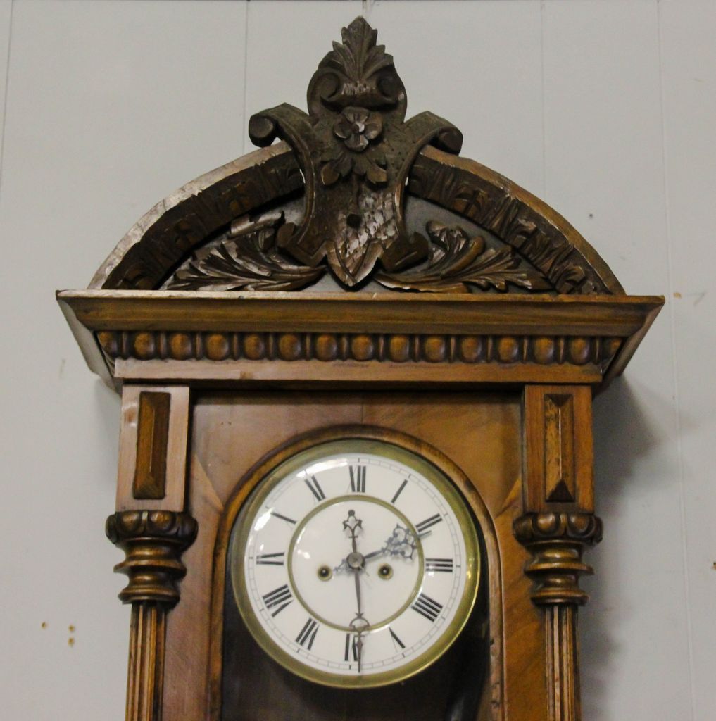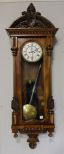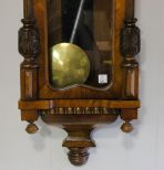 French weight driven wall clock with porcelain dial.; 17" w., 6 1/2" d., 53" h. French weight driven wall clock with porcelain dial.; 17" w., 6 1/2" d., 53" h.