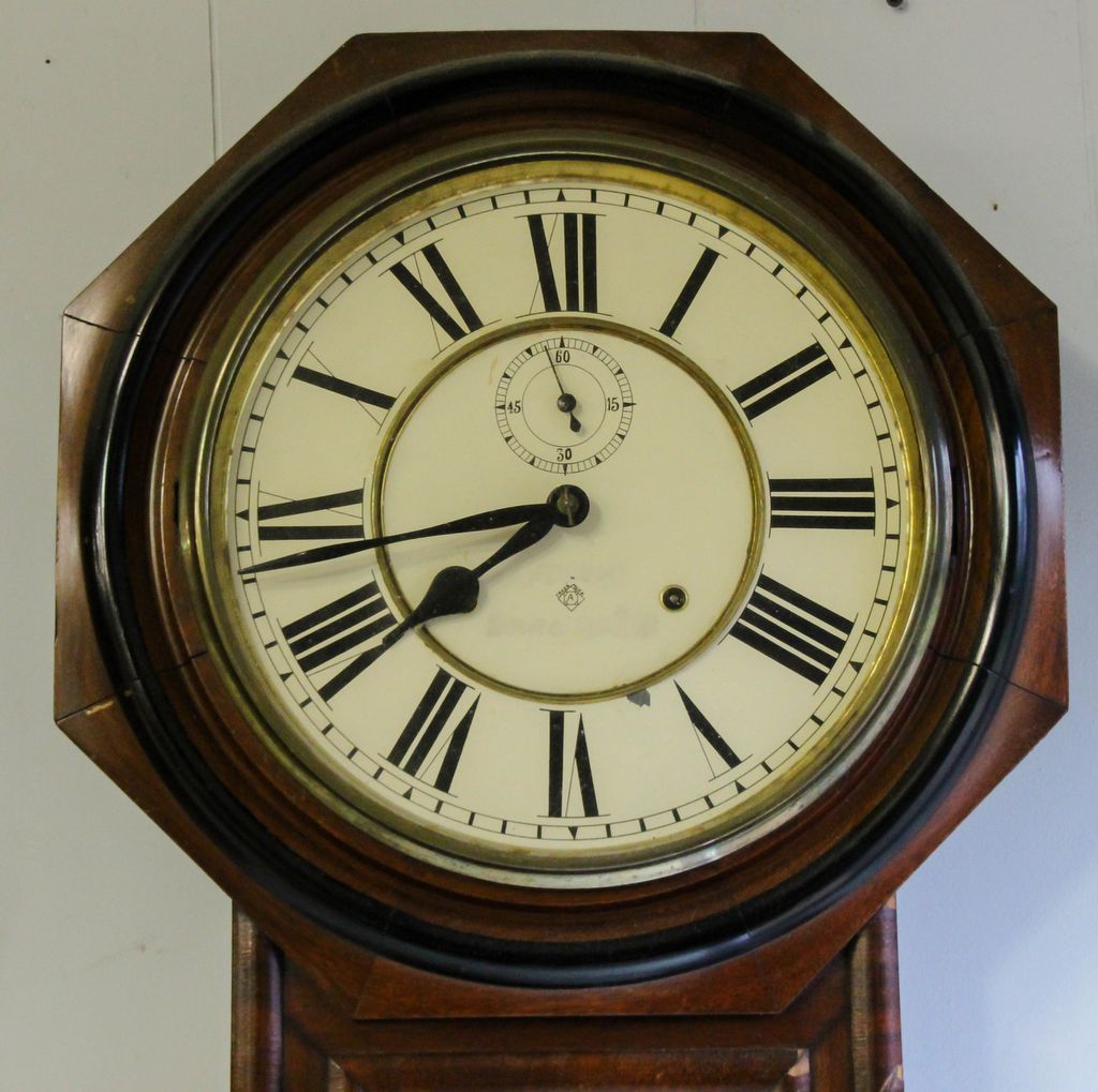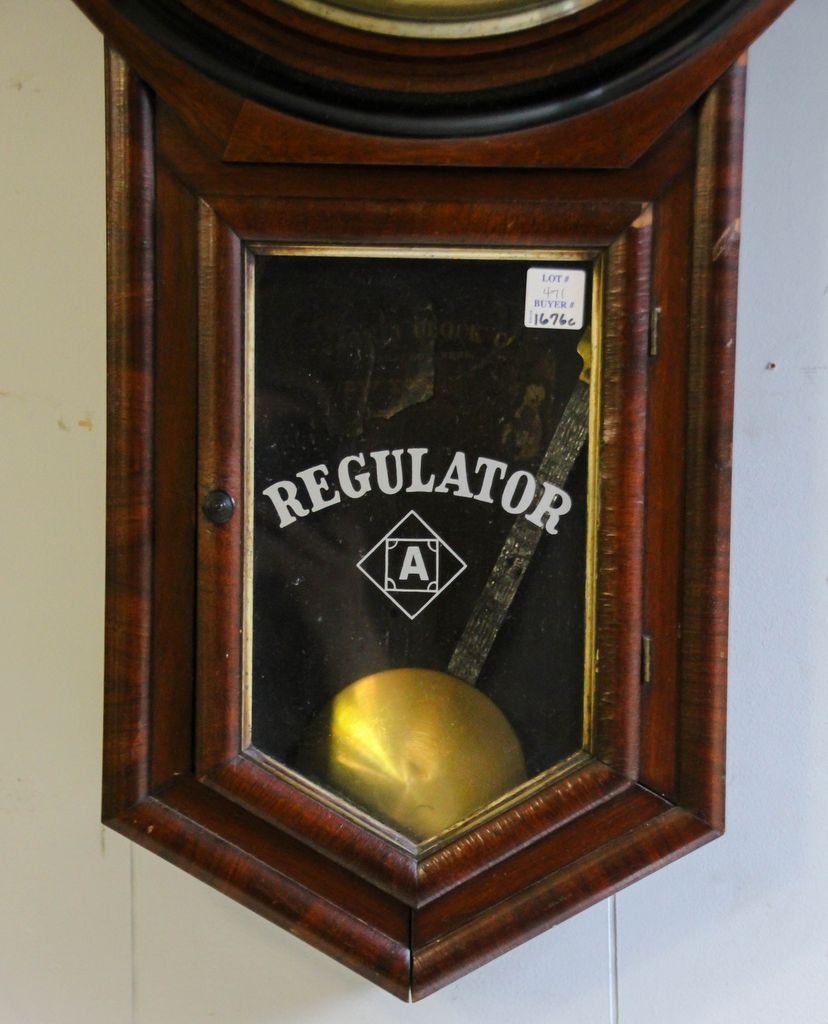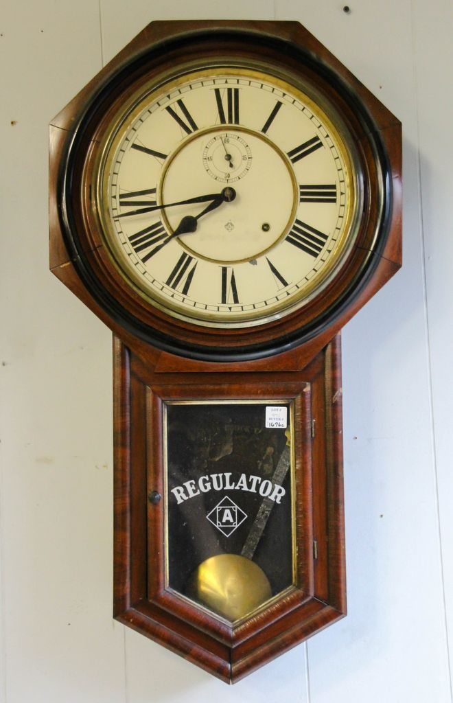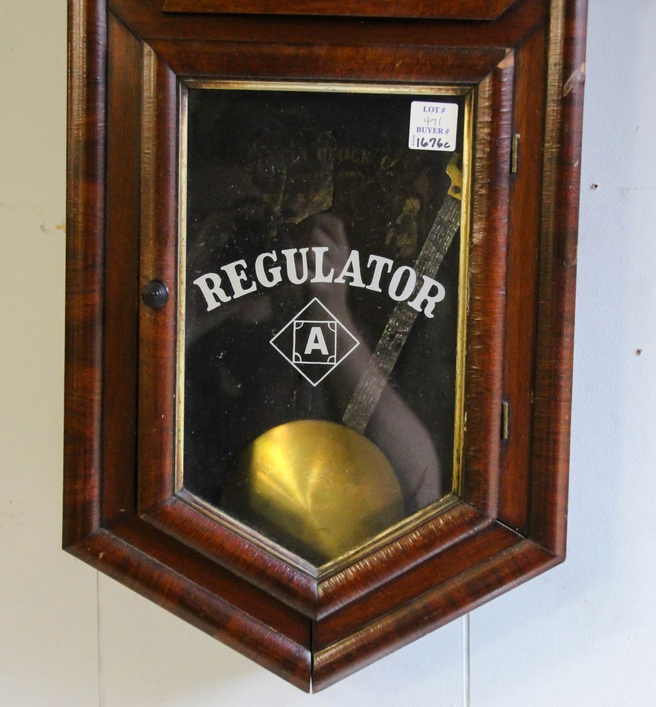 19th century mahogany regulator wall clock.; 17" w., 4" d., 31" h. 19th century mahogany regulator wall clock.; 17" w., 4" d., 31" h.