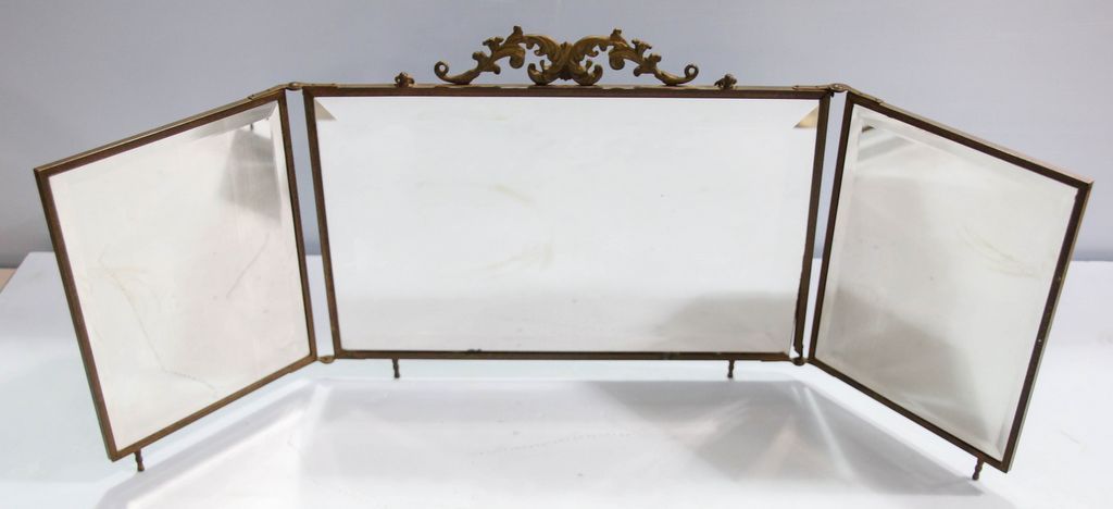 Three section 1930's beveled/brass wall mirror with celluloid cameo designs on the front.; Center- 16 1/4" w., 10 1/4" h. Sides- 8" w. Three section 1930's beveled/brass wall mirror with celluloid cameo designs on the front.; Center- 16 1/4" w., 10 1/4" h. Sides- 8" w.