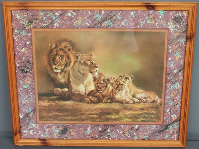 Print of Lions, signed Fong Gilfford, broken glass; 23" w., 19" h. Print of Lions, signed Fong Gilfford, broken glass; 23" w., 19" h.