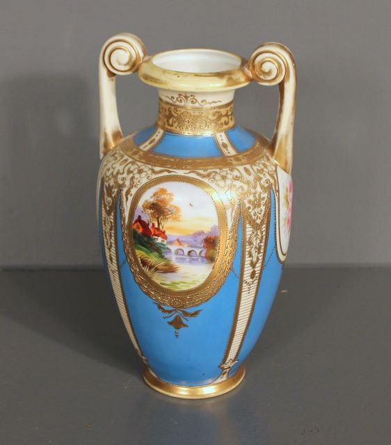 Handpainted Noritake Japan Vase, blue ground with raised gold decoration, village scene, marked on bottom 10" h. Handpainted Noritake Japan Vase, blue ground with raised gold decoration, village scene, marked on bottom 10" h.