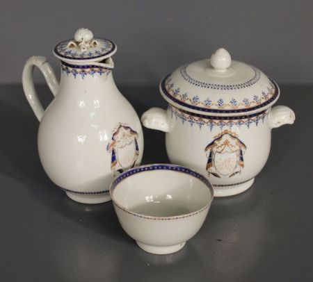 Three Pieces of Chinese Export Porcelain, blue and white covered sugar 5" h., covered pot 6" h., and cup Three Pieces of Chinese Export Porcelain, blue and white covered sugar 5" h., covered pot 6" h., and cup