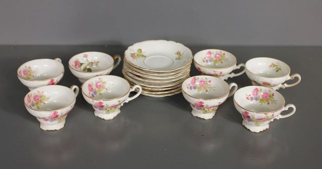 Eight Porcelain Cups and Saucers, various but similar white porcelain cups and saucers with handpainted roses 5" dia. Eight Porcelain Cups and Saucers, various but similar white porcelain cups and saucers with handpainted roses 5" dia.