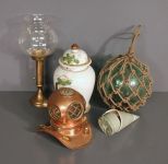 Group of Miscellaneous Items, group includes; covered ginger jar 10 1/2" h., hurricane/brass candlestick 14" h., two marbleized pieces, copper miniature driving helmet 7" h., and glass ball 7 1/2" dia. Group of Miscellaneous Items, group includes; covered ginger jar 10 1/2" h., hurricane/brass candlestick 14" h., two marbleized pieces, copper miniature driving helmet 7" h., and glass ball 7 1/2" dia.