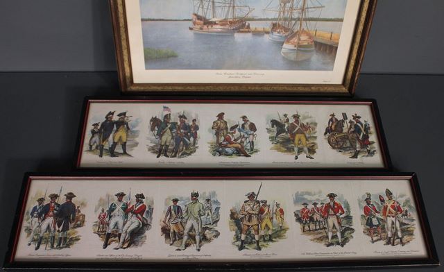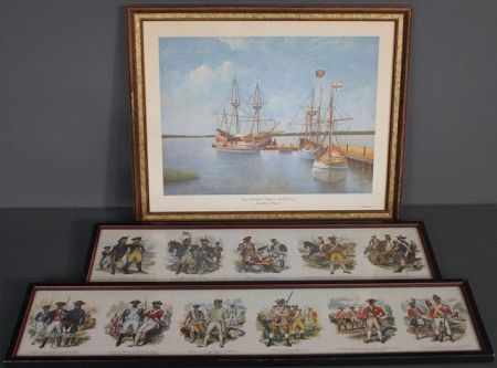 Group of Three Prints, two prints of soldiers 21"-25" w., 6 1/2" h. and one signed print of ships 17 1/2" w., 13 1/2" h. Group of Three Prints, two prints of soldiers 21"-25" w., 6 1/2" h. and one signed print of ships 17 1/2" w., 13 1/2" h.