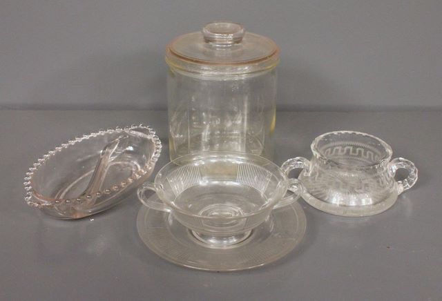 Four Pieces of Glass, which include; District of North Carolina glass store jar 7 1/2" h.; etched Greek key open sugar 6" w.; Imperial candlewick two section relish dish 8 1/2" w.; heisey-pleat and panel cream soup and plate 7" dia. Four Pieces of Glass, which include; District of North Carolina glass store jar 7 1/2" h.; etched Greek key open sugar 6" w.; Imperial candlewick two section relish dish 8 1/2" w.; heisey-pleat and panel cream soup and plate 7" dia.