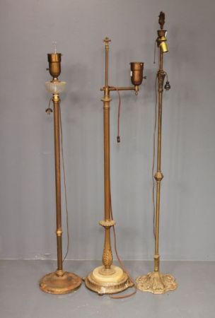 Three Vintage Floor Lamps, needing restoration, brass and iron, one has glass font; 54" h. Three Vintage Floor Lamps, needing restoration, brass and iron, one has glass font; 54" h.