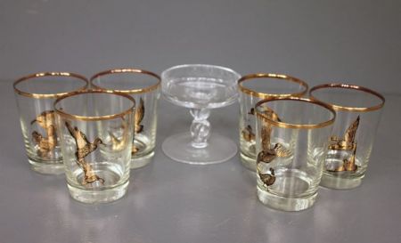 809 Set of Six Tumblers with Hand Painted Birds along with Glass Compote