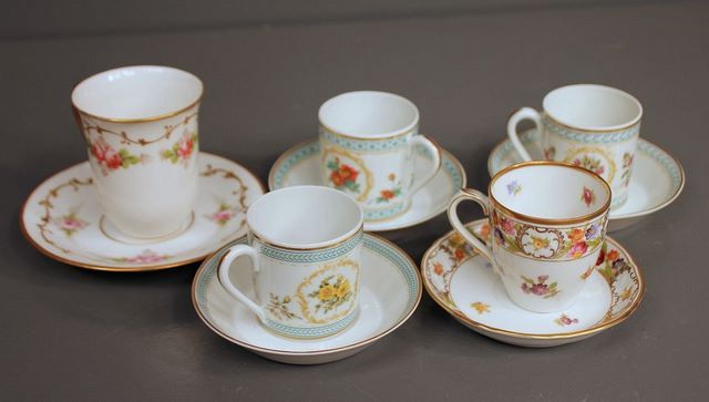 Five Demitasse Cups and Saucers; three Austrian Copper, Haviland green border 2 1/4" h., Schumann empress 2 1/2" h., Imperial flower design 3 1/2" h. Five Demitasse Cups and Saucers; three Austrian Copper, Haviland green border 2 1/4" h., Schumann empress 2 1/2" h., Imperial flower design 3 1/2" h.