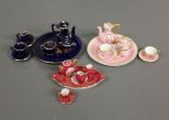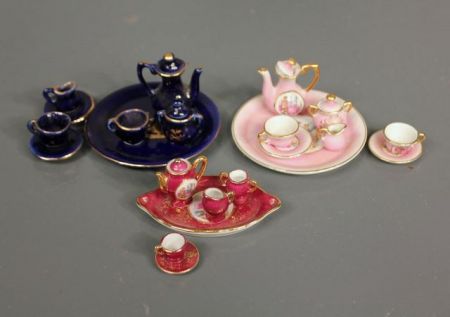 Three Miniature Tea Sets, one cobalt, one pink and one cranberry; 4 1/4" dia., tray Three Miniature Tea Sets, one cobalt, one pink and one cranberry; 4 1/4" dia., tray