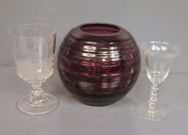 Three Pieces of Glass; one purple rose bowl 5 1/2" dia., one 6 1/2" h. etched spooner, one 6" h. wine glass (chip on rim) Three Pieces of Glass; one purple rose bowl 5 1/2" dia., one 6 1/2" h. etched spooner, one 6" h. wine glass (chip on rim)