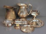 Group of Silverplate Items, including; two pitchers 9" h., covered butter 7" l., cigarette lighter 3 1/2" dia., basket 4" x 5", covered butter (round) 5 1/2" dia., two plates 4" dia. Group of Silverplate Items, including; two pitchers 9" h., covered butter 7" l., cigarette lighter 3 1/2" dia., basket 4" x 5", covered butter (round) 5 1/2" dia., two plates 4" dia.