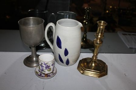 Group of Miscellaneous Items, with brass candlestick 7" h., Williamsburg pottery pitcher 6 1/2" h., Germany cup (chip) with saucer 2" dia., pewter goblet 6 1/2" h. Group of Miscellaneous Items, with brass candlestick 7" h., Williamsburg pottery pitcher 6 1/2" h., Germany cup (chip) with saucer 2" dia., pewter goblet 6 1/2" h.