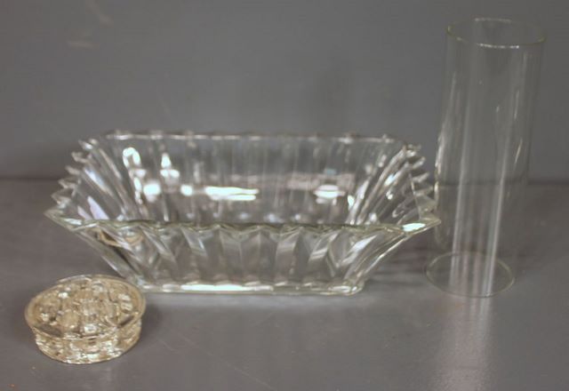 Three Pieces of Glass; Chimney 8" h., 3" dia., center bowl 11" w., frog 3" dia. Three Pieces of Glass; Chimney 8" h., 3" dia., center bowl 11" w., frog 3" dia.