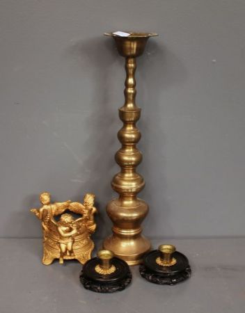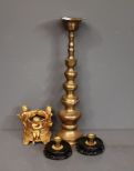 Group of Four Candlesticks; one gold painted with cherubs 5 1/2" dia., one tall brass 16" h., pair of small brass on wood bases 3 1/2" dia. Group of Four Candlesticks; one gold painted with cherubs 5 1/2" dia., one tall brass 16" h., pair of small brass on wood bases 3 1/2" dia.