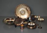 Group of Silverplate, including; two champagne glasses 5 1/4" h., oval gravy boat 8 1/2" l., bowl with underplate 7 1/2" dia., cup 3" dia., two small dishes, one bowl with Pyrex lining 10" dia., dip tray 11" dia., 6 1/4" dia. Bowl Group of Silverplate, including; two champagne glasses 5 1/4" h., oval gravy boat 8 1/2" l., bowl with underplate 7 1/2" dia., cup 3" dia., two small dishes, one bowl with Pyrex lining 10" dia., dip tray 11" dia., 6 1/4" dia. Bowl