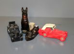 Four Vintage Bottles; one of shepherd dog 6 1/2" h., steamboat 5 1/2" w., 3 1/2" h., blue car 6" w., red car 7" w. Four Vintage Bottles; one of shepherd dog 6 1/2" h., steamboat 5 1/2" w., 3 1/2" h., blue car 6" w., red car 7" w.