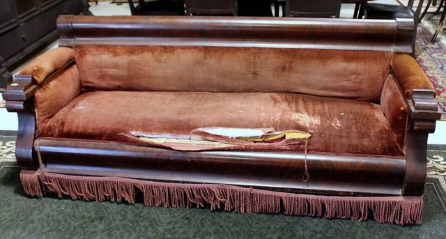 Period 19th Century Mahogany Empire Sofa, in original condition, needs upholstery; 79" w., 28" d., 32" h. This item sold to BuyNow Customer. Period 19th Century Mahogany Empire Sofa, in original condition, needs upholstery; 79" w., 28" d., 32" h. This item sold to BuyNow Customer.