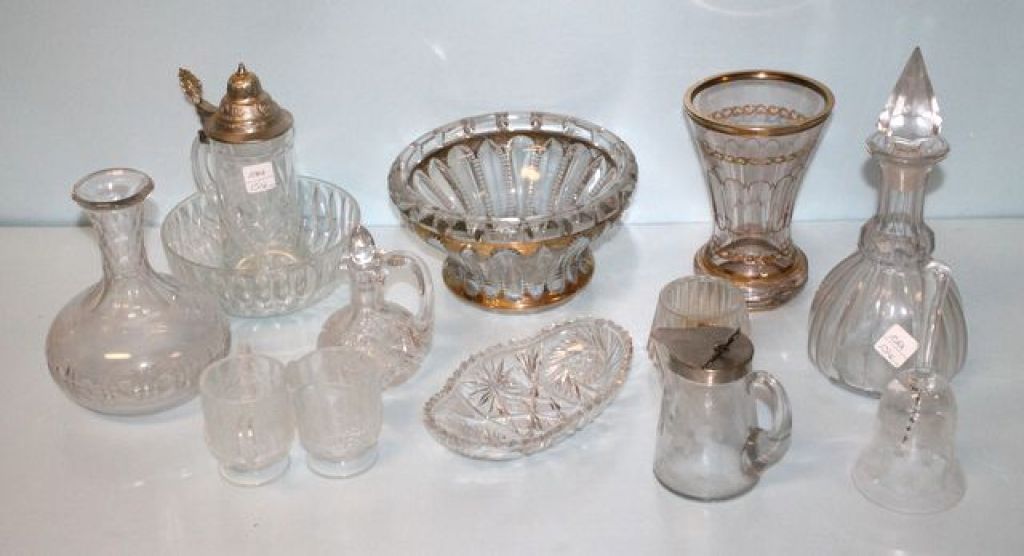 1022 Glass Decanter, Cruet Stein, Bells, Syrup Pitcher, Vase & Bowl