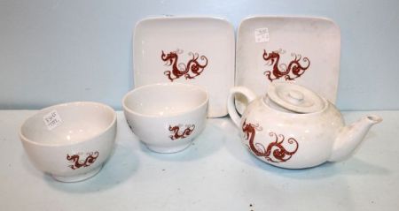 831 Dragon Designed Teapot, Two Square Plates & Two Bowls