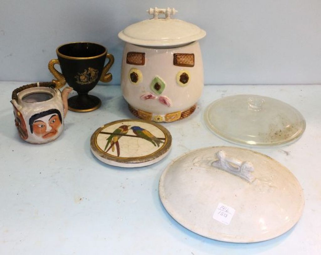 Cookie jar base (no lid), ceramic Japanese teapot (no lid, has four faces), three lids, Persian painted trivet 6 1/4" dia (chips) Cookie jar base (no lid), ceramic Japanese teapot (no lid, has four faces), three lids, Persian painted trivet 6 1/4" dia (chips)
