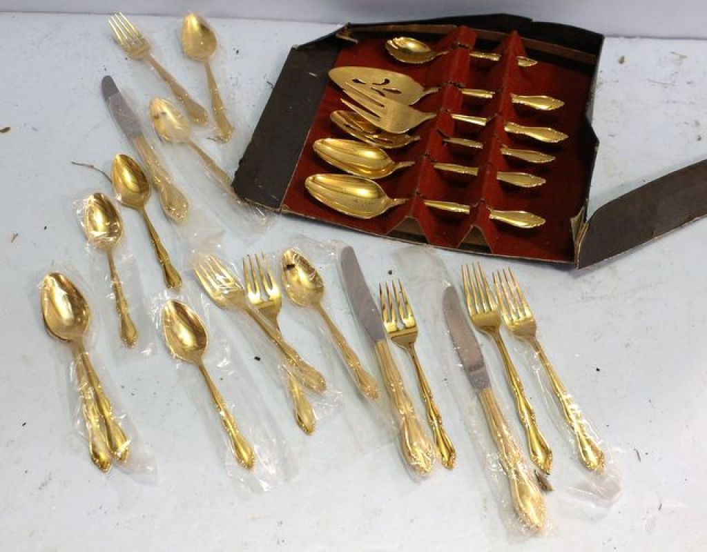 Including three salad forks, three dinner forks, five teaspoons, three tablespoons, three knives, sugar spoon, three serving spoons, fork and pie server Including three salad forks, three dinner forks, five teaspoons, three tablespoons, three knives, sugar spoon, three serving spoons, fork and pie server