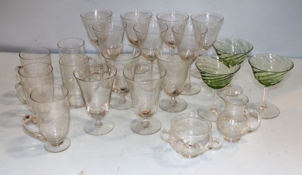 1502 Group of Various Etched Glasses & Creamer/Sugar