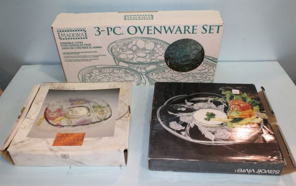 671 Three Piece Glass Casserole Set & Two Glass Trays