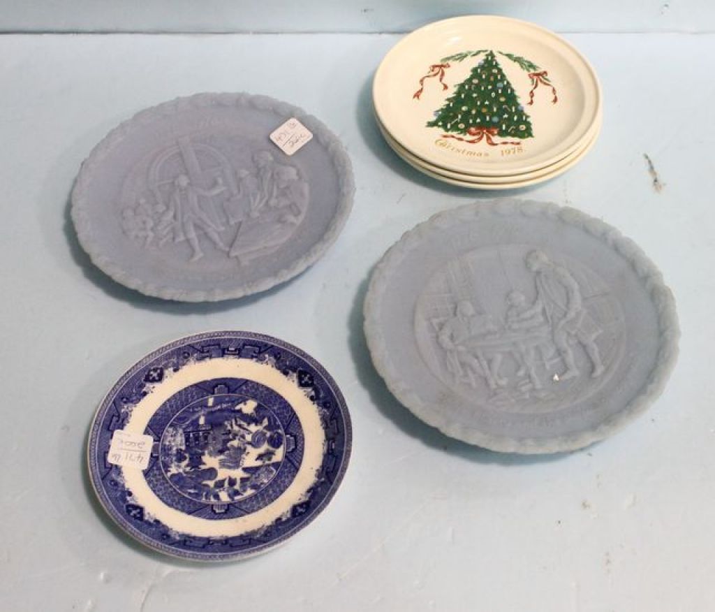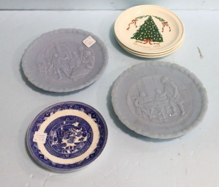 471 Two Blue Fenton Plates, Three Christmas Plates & Blue Willow Saucers
