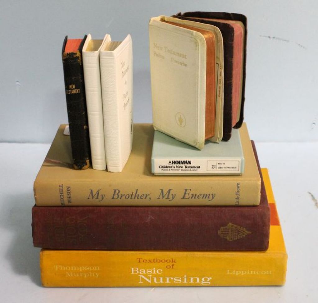 Six small New Testament Bibles, My Brother My Enemy, Egermeiers Bible story book & textbook of basic nursing Six small New Testament Bibles, My Brother My Enemy, Egermeiers Bible story book & textbook of basic nursing
