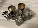 Rogers Sterling weighed Cordial, Lunt Sterling 572, Mexico .925 Sterling Shot Glasses, missing two glass inserts. Rogers Sterling weighed Cordial, Lunt Sterling 572, Mexico .925 Sterling Shot Glasses, missing two glass inserts.