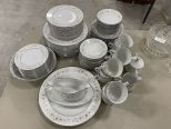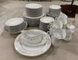 Set of Carlton "Andover" Dinnerware, dinner plates, bowls, charger, gravy, dessert plates, saucers and cups. Location Back Front Side Metal Shelves 3rd Shelf Set of Carlton "Andover" Dinnerware, dinner plates, bowls, charger, gravy, dessert plates, saucers and cups. Location Back Front Side Metal Shelves 3rd Shelf