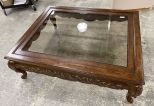 Large Cherry French Style Coffee Table, beveled glass top, 17"h., 50"w., 40"d. one leg weak. Location Front Large Cherry French Style Coffee Table, beveled glass top, 17"h., 50"w., 40"d. one leg weak. Location Front