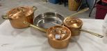 Brass pots and pans, four pieces. Location Back Silver Metal shelves Brass pots and pans, four pieces. Location Back Silver Metal shelves