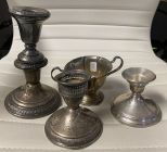 Couchin Creation sterling candle holder, sterling candle holder, sterling cup, Frank M Whiting Sterling candle holder, several have dents and damage. Couchin Creation sterling candle holder, sterling candle holder, sterling cup, Frank M Whiting Sterling candle holder, several have dents and damage.