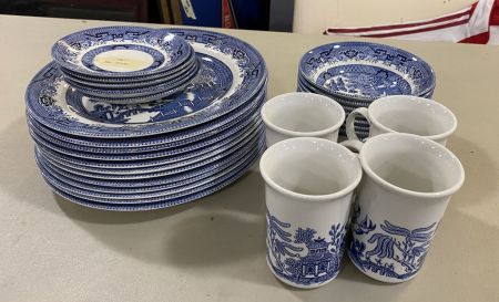 Churchill Blue & White China, 12 dinner, 8 bowls, four cups and saucers. Location Front Shelves 3rd Shelf Churchill Blue & White China, 12 dinner, 8 bowls, four cups and saucers. Location Front Shelves 3rd Shelf