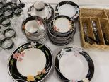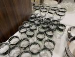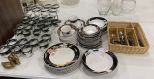 Sangostone China Set and Stem Ware, plates, bowls, dessert plates, salad plates, dinner plates, serving bowl, wine glasses, cups. Location Front Shelves 3rd Shelf Sangostone China Set and Stem Ware, plates, bowls, dessert plates, salad plates, dinner plates, serving bowl, wine glasses, cups. Location Front Shelves 3rd Shelf
