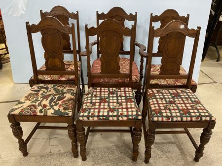 Six Colonial Revival Dining Chairs, five side chairs, one arm, walnut, depression era, arm chair has non matching cushion. Location Right Side 4th Row Six Colonial Revival Dining Chairs, five side chairs, one arm, walnut, depression era, arm chair has non matching cushion. Location Right Side 4th Row