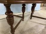 Colonial Revival Dining Table, no leaves, glass top, depression era, has wear, one center leg has loose bolt, 30"h., 54"w., 40"d. Location Right Side 4th Row Colonial Revival Dining Table, no leaves, glass top, depression era, has wear, one center leg has loose bolt, 30"h., 54"w., 40"d. Location Right Side 4th Row