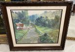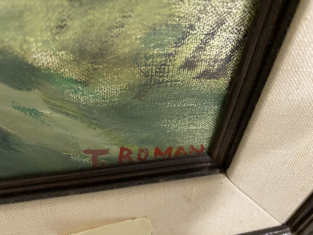 Decor Oil of Country Road by T. Roman, on canvas, framed, 33"h., 40"w. Location Back of Center Decor Oil of Country Road by T. Roman, on canvas, framed, 33"h., 40"w. Location Back of Center